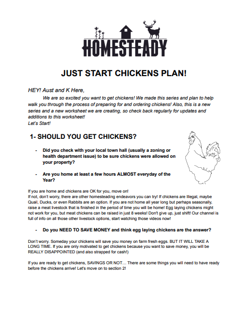 This plan walks you through the process of preparing for, ordering, and getting your chickens, all in simple steps. If you have wanted to start with chickens but have been overwelmed by all the things you need to do to prepare for them, this plan will make it easy for you!
